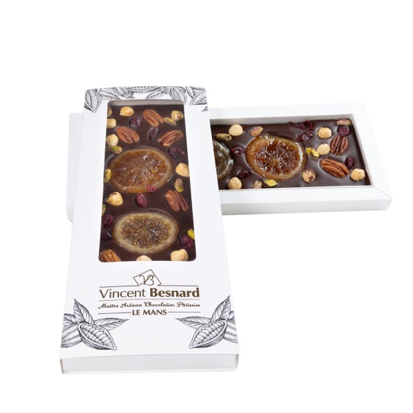 Ingrédients : chocolat noir (pâte de cacao, sucre, beurre de cacao, émulsifiant : lécithine de soja, arôme naturel de vanille), écorce d'orange confite (orange, sucre, sirop de glucose), écorce de citron confit (citron, sucre, sirop de glucose), noisette, noix de pécan, pistache, cranberries
