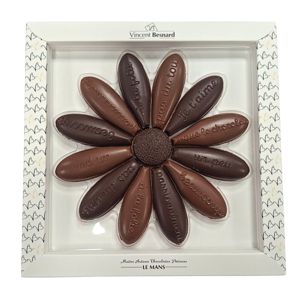 Ingrédients : gianduja (sucre, noisettes, beurre de cacao, lait entier en poudre, masse de cacao, lécithine de soja, arôme naturel de vanille), praliné (noisettes, sucre caramélisé, émulsifiants (mono- et diglycérides d'acides gras, lécithine de soja)), chocolat (sucre, beurre de cacao, poudre de lait entier, pâte de cacao, lécithine de soja, arôme naturel de vanille)